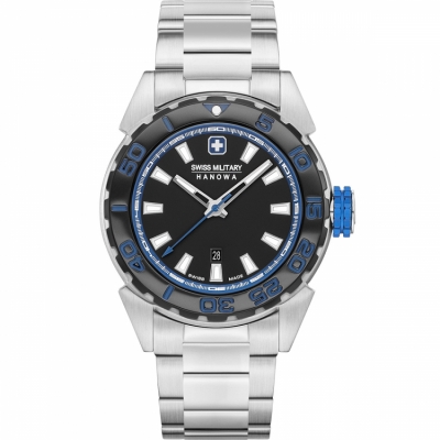 Reloj suizo con esfera negra , bisel giratorio negro con numeros azules , resistente al agua.