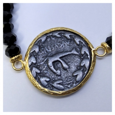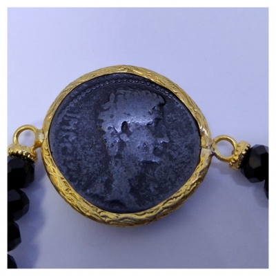Pulsera elástica de bolitas negras acabado con una moneda romana por las dos caras. Muy cómoda de colocar