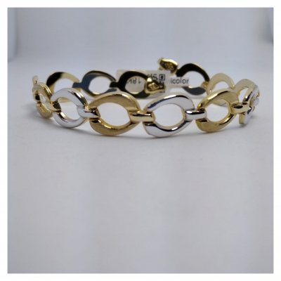 Pulsera bicolor oro amarillo y blanco 18k intercalando las tonalidades del color, realizando un diseño ovalado. Cierre mosquetón. Se envia caja y bolsa de regalo.