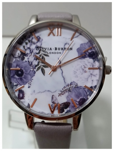 Reloj con caja plateada y agujas rosé. Su correa es de piel , la esfera de flores imitando al marmol.