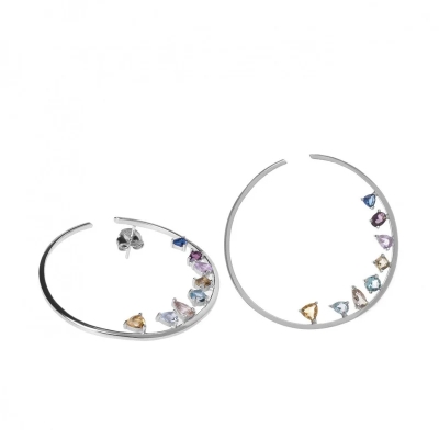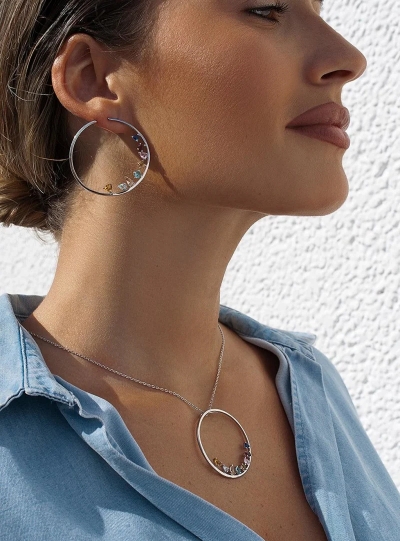 Collar de plata grande circular con cuarzos adamantinos disposición asimétrica multicolor. Collar de plata grande con detalle de cuarzos adamantinos multicolores y diferentes tallas. Combínalos con los pendientes aro originales. ¡Un diseño diferente y atrevido!.