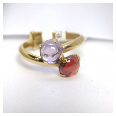 Anillo oro amarillo 18k con dos circonitas en malva y naranja ópalo de fuego sujetadas con cuatro garras cada una de ellas. Presentamos la joya en su caja y bolsa de regalo