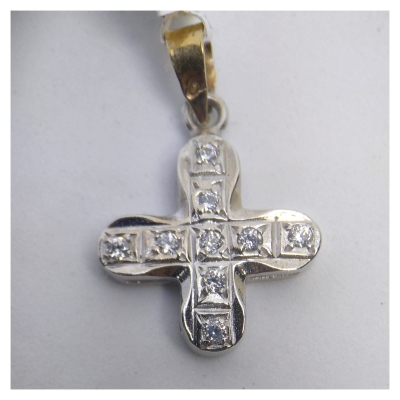 Colgante oro blanco 18k con circonitas y anilla de oro amarillo 18k. Presentamos la joya en caja y bolsa de regalo.
