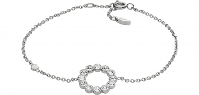 Pulsera Acero con cadena fina adornado de unas circonitas blancas en forma de flor. Su cierre es através de un mosquetón.