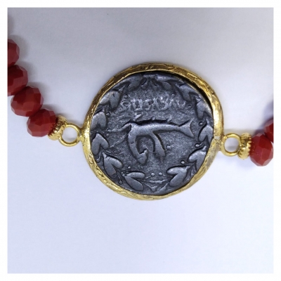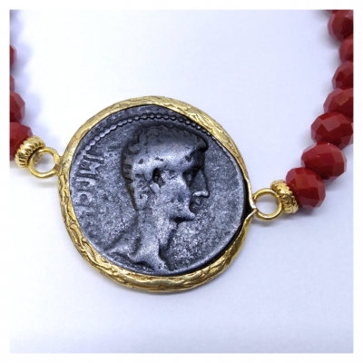 Pulsera elástica color granate adornada con una moneda romana